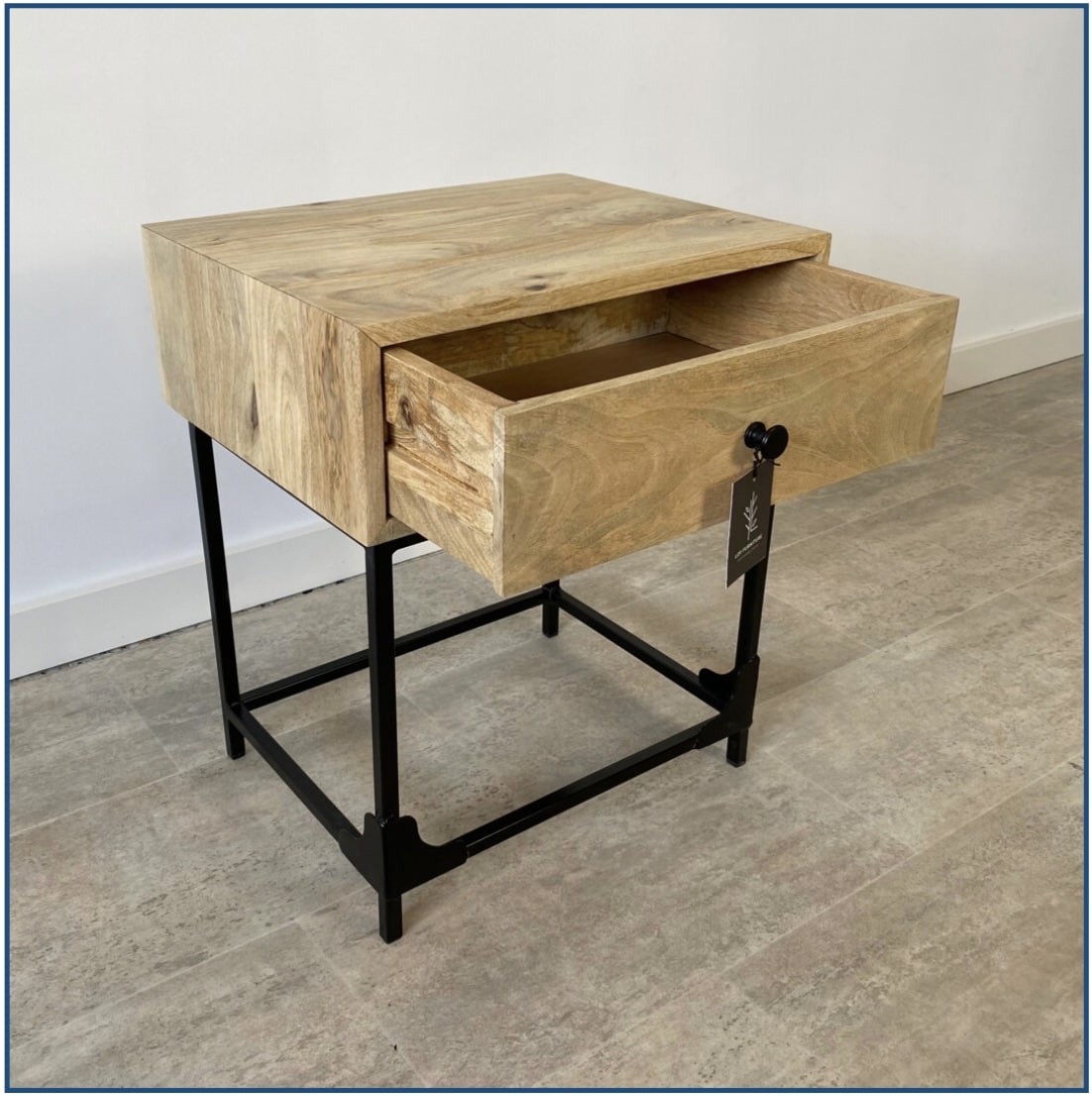 Minimalistic and contemporary bedside table made from mango wood, with one storage drawer and black framework.