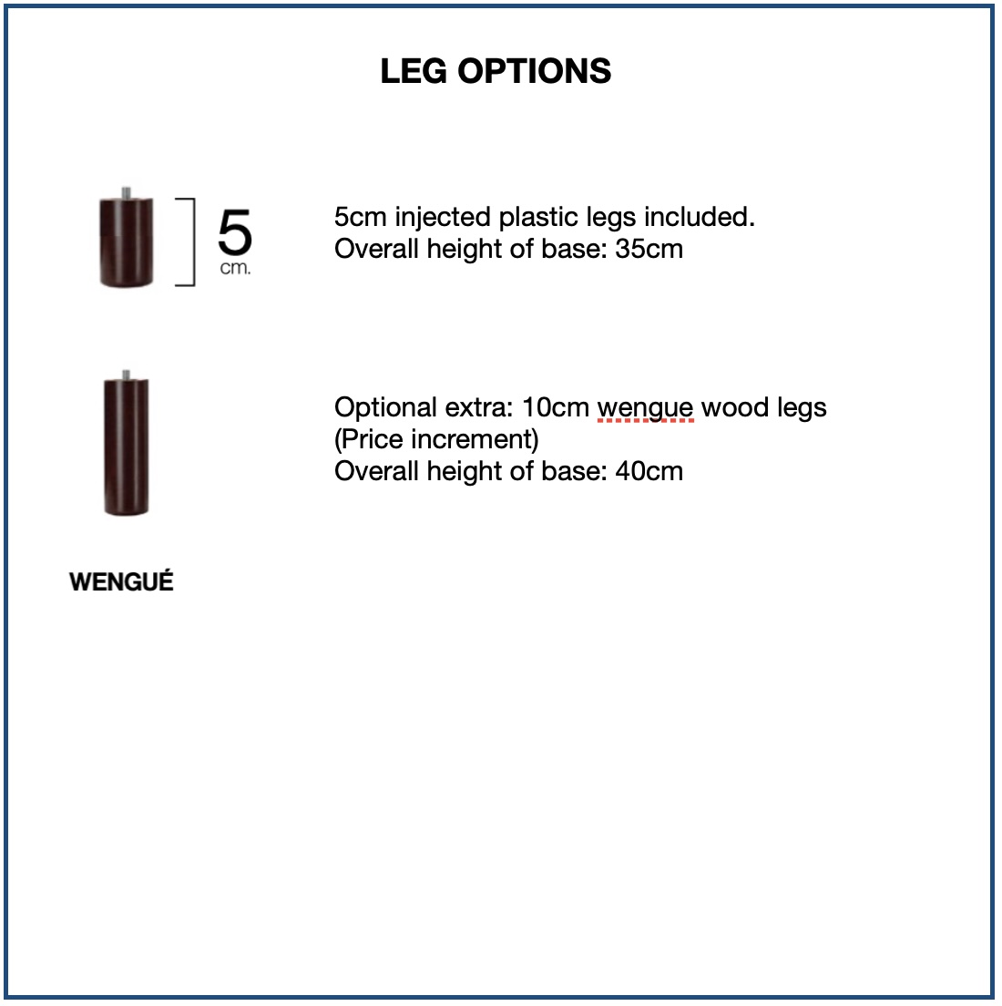Two leg options to choose from: 5cm plastic (standard) or 10cm wengue wood (additional cost).